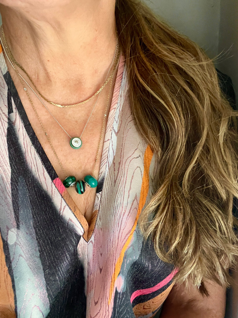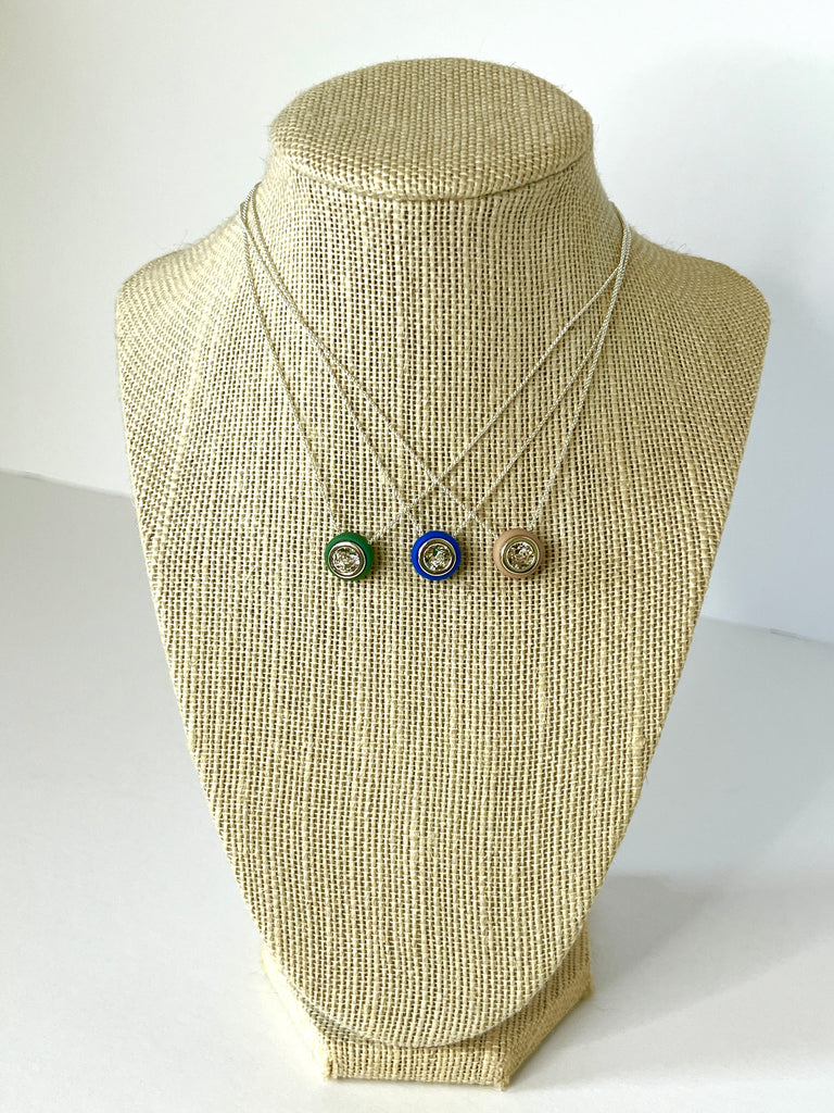 Resin disc, half inch in diameter, with a round, Swarovski crystal that's bezel set in sterling silver. Hangs on a delicate, sterling silver curb chain. Measures 17 1/2 inches long, but adjustable to 15 1/2 or 16 1/2 inches if a shorter length is desired. Available in three colors: Caramel, Grass and Big Sky.